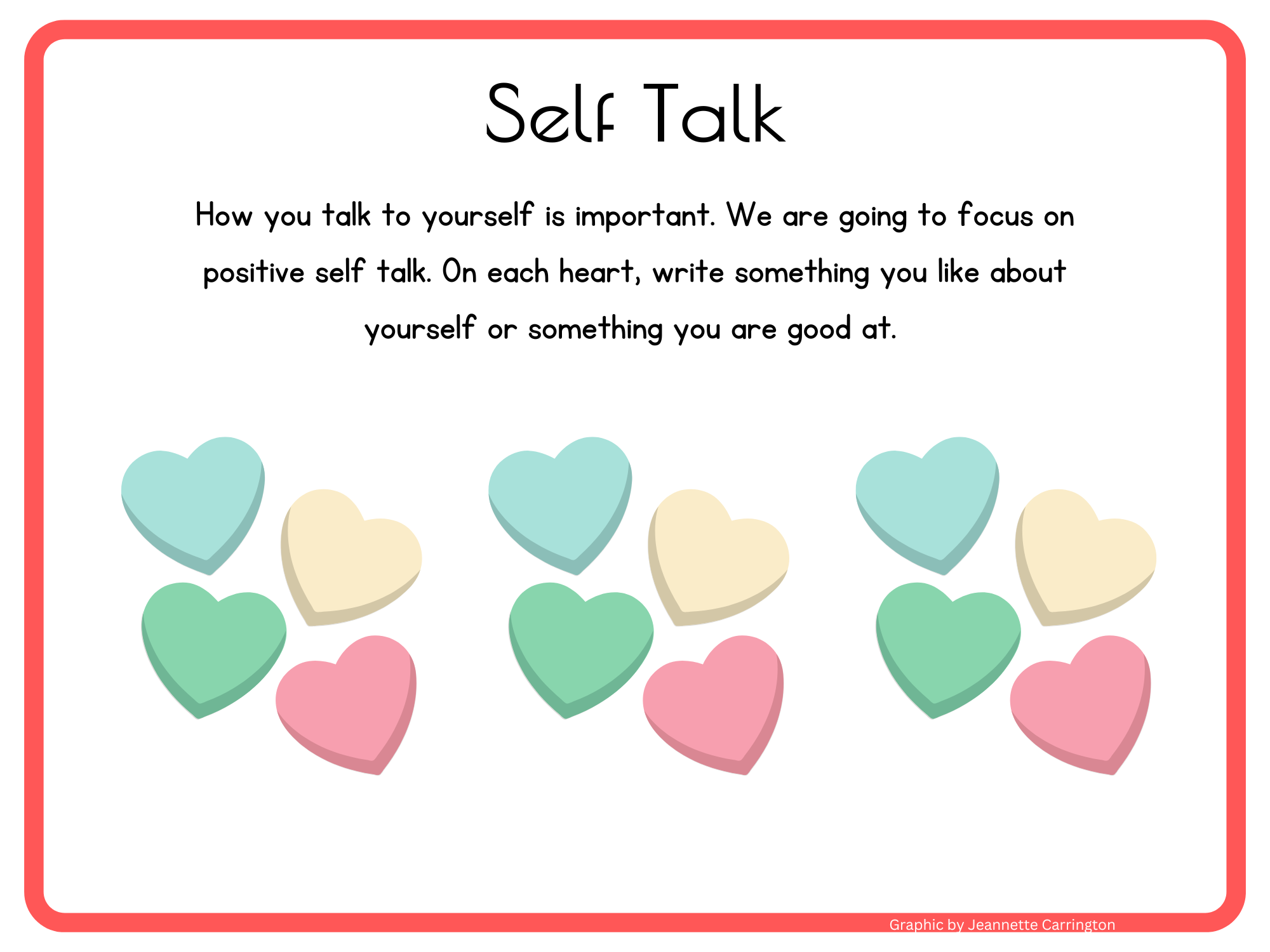 How you talk to yourself is important. We are going to focus on positive self talk. On each heart, write something you like about yourself or something you are good at.
