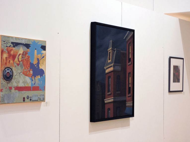 #6_faculty arwork2 04/07/201504/07/2015 Staff Contributor Faculty Artwork-2 From left to right: On a Pale Horse by Jason Bly; Portrait of a Masard Roof by Chris Brennan; Bluff Shapes by Jeff Vaughn