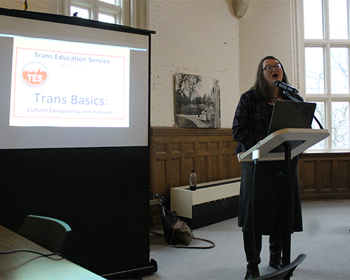 Lewis and Clark kicked off LGBTQ+ Health Awareness Week with a presentation by Jaimie Hileman in Reid Memorial Library. The presentation, titled Trans Basics, covered cultural competency about issues related to transgender people, as well as advice for better inclusion.